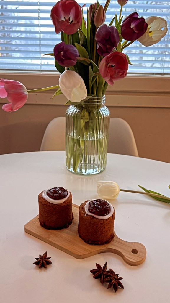 Torta de Runeberg (Finlandês: Runebergintorttu). Um doce Finlandês a base de amêndoa com geléia de framboesa envolta por um anel de acuçar.